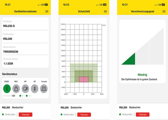 Aplicația mobilă RSL 200 permite accesul ușor la informații de stare și date de diagnosticare prin Bluetooth – chiar dacă accesul la dispozitiv este limitat. Permite importante informații detaliate care trebuie colectate de la distanță fără a fi nevoie să întrerupeți câmpul de protecție. Toate mesajele sunt afișate în text simplu și, dacă este necesar, pot fi trimise direct la centrul de service Leuze.